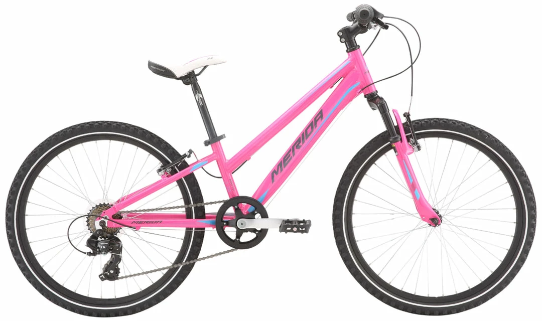The Merida Matts J24 Girls Bike is a fun and cool bike for 8-13 year olds who want to enjoy riding in comfort on two wheels. The lightweight alloy frame is much easier to handle and control than a steel frame which kids bikes usually use. The Matts J24 is built specifically for kids with its lower standover height and 24″ wheels for comfort and control. While the durable suspension fork and alloy rims are built to handle the bumps kids may encounter so that this bike can last through a few challenges. Combine that with the reliability of V-brakes and you have a fun and durable bike for your kids to ride and enjoy the great outdoors. Whether it’s your kids first bike or just an upgrade once they have outgrown their old bike, the Merida Matts J24 is a great choice for your kids next bike.