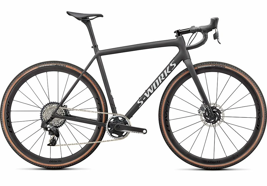 This S-Works Crux comes spec’d with SRAM’s pinnacle RED eTap AXS hydraulic disc groupset, lightweight and durable Roval Terra CLX Disc wheels, and 2Bliss Ready, 700x38mm Pathfinder Pro tires that hookup over nasty terrain.
