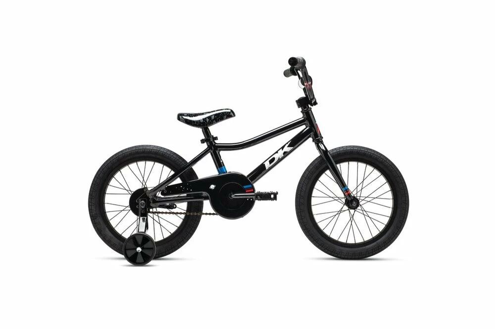 With the included training wheels in place, the Devo 16” helps young riders figure the whole “balancing while pedaling” fundamentals of riding a bicycle. With a lightweight and sturdy aluminum frame and rims, the Devo is easy for little people to handle on the bike path and easy for parents to load into the car or hang up in the garage. The quick release seat clamp makes adjusting the seat height easy and tool-free. A coaster brake and full-coverage chainguard are “safety-first” features that make the Devo easy to ride and give you peace of mind. When the big day comes, take the training wheels off and set them free — the DK Devo 16” is the bike your kid will always remember.