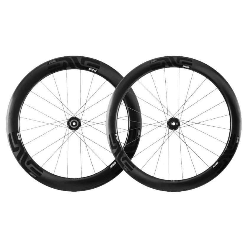 Ultimate Road Race Wheelset This SES 5.6 Disc Brake wheelset from ENVE is the ultimate disc brake specific, aerodynamic, and lightweight road race wheelset. Aero Optimised for Disc The SES 5.6 Disc is optimized aerodynamically and structurally for disc use. Road cyclists and triathletes on disc brake bikes will benefit from the SES 5.6 Disc’s reduced drag, lightweight design, and rim shape optimized for larger volume road tyres. Only The Best Carbon Laminate At ENVE, only the best materials are used in the construction of their rims. In this case, 100% unidirectional carbon fibre. Over the years ENVE have developed and identified specific construction methods, resin systems, and manufacturing techniques that best serve the application. The result is that the laminate is optimized to create a structure that achieves the desired impact resistance, stiffness, and compliance. Disc Brake Benefits The introduction of the disc brake and the elimination of a braking surface opens up the realm of aerodynamic and structural possibilities. When you don’t have to engineer a flat braking surface and manage high temperatures from braking, you can reduce the rim’s weight, adjust shape for improved aerodynamics and provide better tubeless performance. Lightweight, Aerodynamic, Impact Resistant The SES 5.6 Disc features patented SES rim curvature but has been further optimized for disc brakes. Additionally, the SES 5.6 Disc carbon fibre clinchers and tubulars are very lightweight because the material used for heat management can been eliminated. This allows for a more structurally efficient and impact resistant rim. Finally, the SES 5.6 Disc carbon clincher is road tubeless compatible and can still be run with standard inner tubes and tyres. Like the current generation of SES carbon clinchers and tubulars, the 5.6 Disc has been aerodynamically optimized around 25mm tyres.
