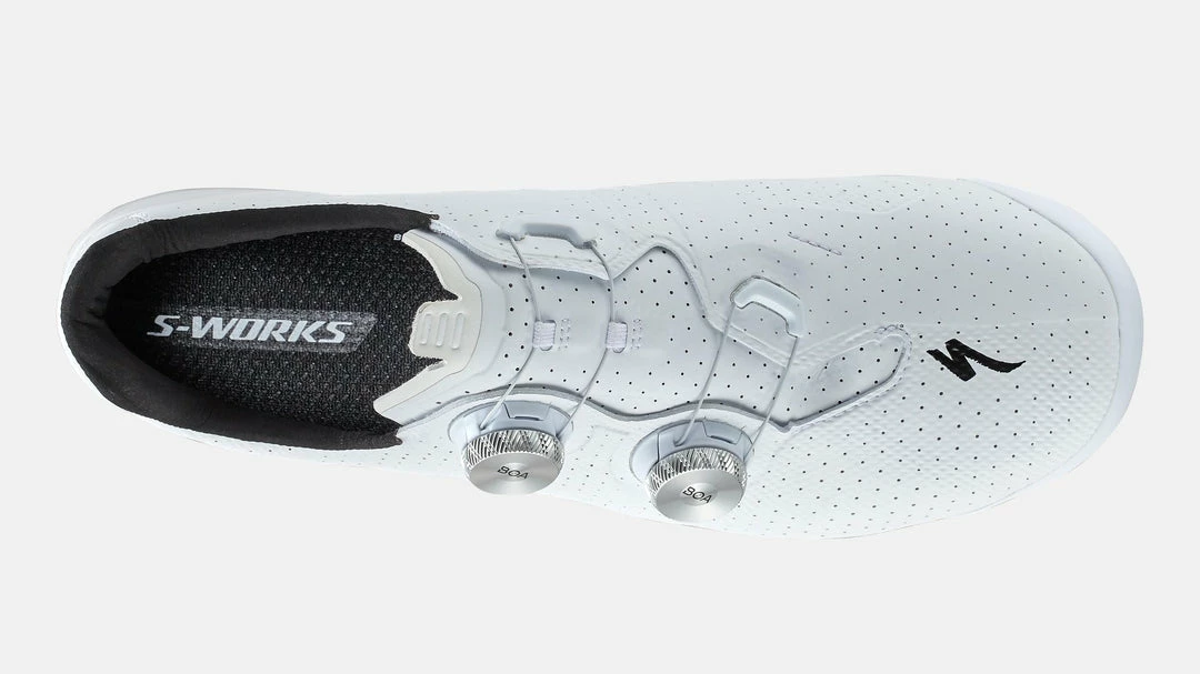 Leveraging data science, we refined every detail of the S-Works Torch’s upper for improved fit and performance. The BOA® cable is shifted down and angled, preventing lift on the ball of the foot and delivering power-enhancing structure while eliminating unwanted pressure or pinching. Adaptive materials allow natural movement of the foot where needed for comfort, while data-driven zonal reinforcement keeps the foot secured for crisp power delivery and optimal efficiency.